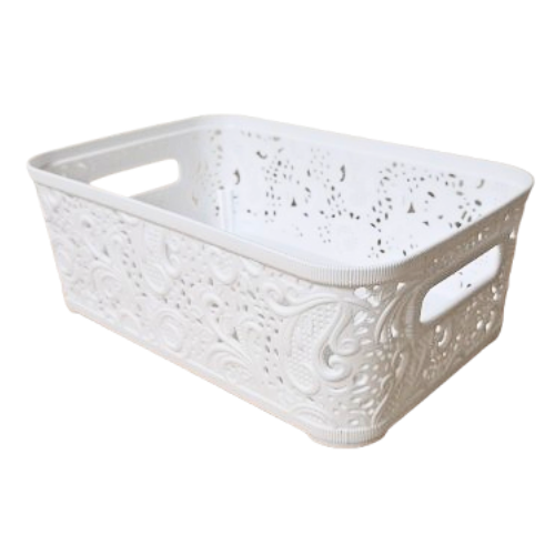 Ажурна кошик призначена для зручного зберігання різних речей - косметики, банного приладдя, дрібних іграшок. Виготовлена кошик з якісного пластику, безпечного для здоров'я людини. Кошик прямокутної форми, з боків є ручки-вушка, бічні стінки виконані у вигляді мереживних узорів. Об'єм 4,7 л. Розміри вироби: 19,5х30х11 см. Колір - білий. Оригінальний зовнішній вигляд кошика для дрібниць стане родзинкою будь-якого інтер'єру.