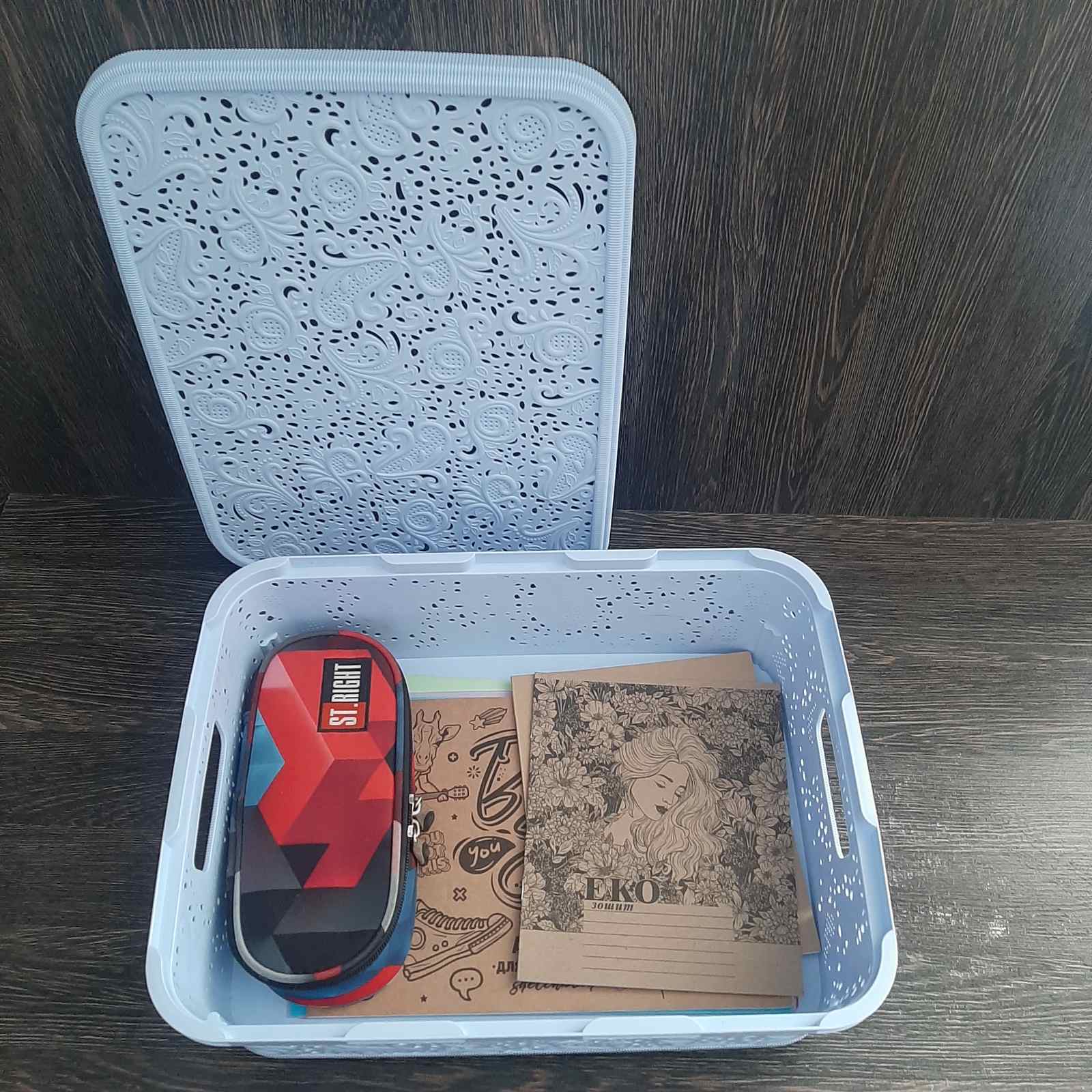 Контейнер для канцелярських дрібничок з вкладкою 27×19×16 см — компактна організація простору вдома, у школі чи в офісі Цей контейнер стане ідеальним рішенням для зберігання шкільного приладдя, офі..